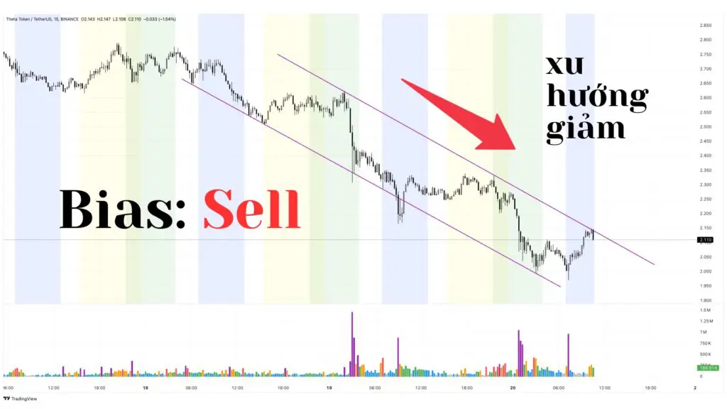 Biểu đồ trên cho thấy xu hướng của sản phẩm đang là xu hướng giảm, và chúng ta sẽ có bias (định hướng) là sell – bán khống.